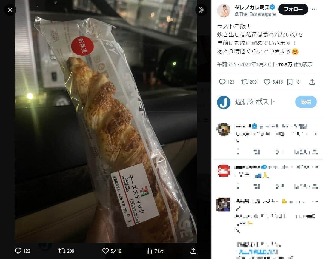 ダレノガレさんは23日早朝にXで、「ラストご飯!」として、コンビニのパンの写真を公開した。「炊き出しは私達は食べれないので事前にお腹に溜めていきます!」と明かし、「あと3時間くらいでつきます」と報告していた。