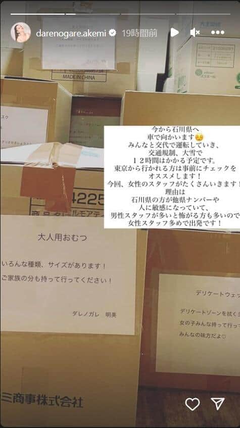 ダレノガレさんは20日頃からXで、石川県へ持っていくスキンケアクリームやワセリン、デリケートシートなどの物資を入手したことを報告していた。その後、22日午後に石川県に向けて出発したと投稿。また、インスタグラムのストーリーズでも「今から石川県へ車で向かいます」「みんなと交代で運転していき、交通規制、大雪で12時間はかかる予定です」と明かした。
