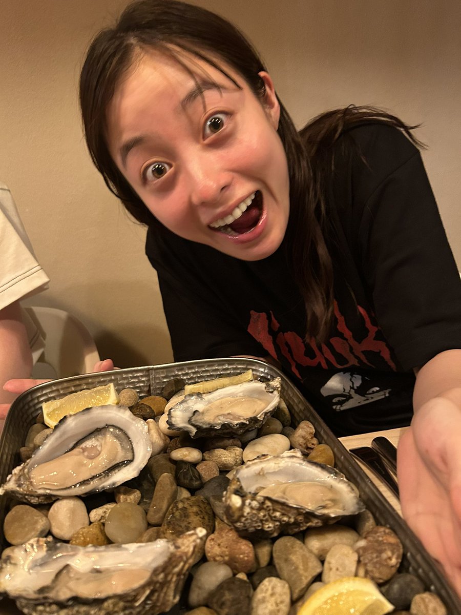 橋本さんはXで「やばっ。また全然投稿してなかった!笑 明日写真集発売なのでオフショット載せます。 撮影のオフショットとスペイン行く前のラウンジでビールと撮影終わりにオイスターです。笑」などと投稿し、4枚の写真を公開。