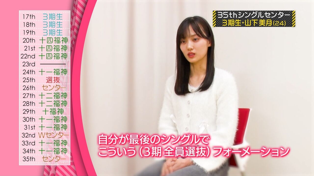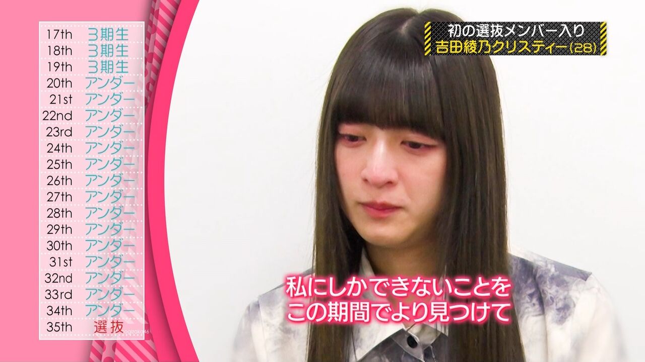 また、吉田綾乃クリスティーが初選抜となり、山下の同期である3期生メンバーが初めて選抜メンバーにそろった。