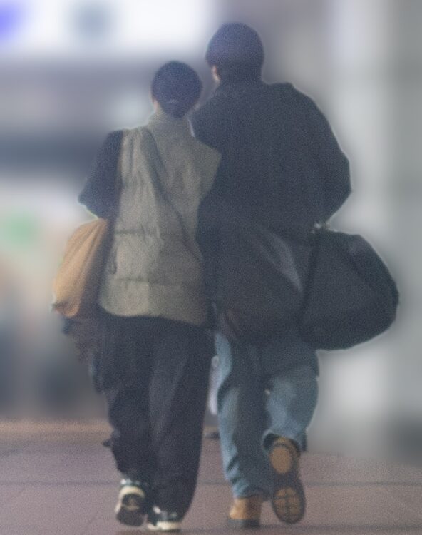ふたりはおそろいのマスクを着用し、山田はサングラスをかけ、黒のデニムジャケット、デニムのワイドパンツという出で立ち。旅支度が入っているのか、かなり大きなバッグを肩から下げている。西野は山田と比較すると身軽で、ベージュのダウンベストに黒いワイドパンツ、スニーカーを合わせたラフな姿だ。