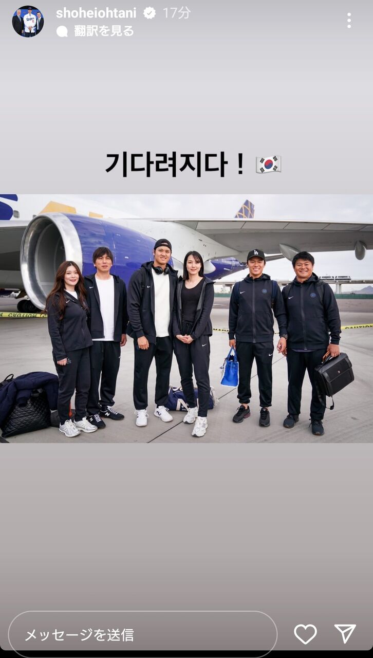 左側には通訳の水原一平夫妻、右には山本由伸と園田芳大通訳が位置する6人で写るほのぼのとしたショット。投稿には韓国語で「待ち遠しい!」記し、開幕シリーズに向けての思いを表した。