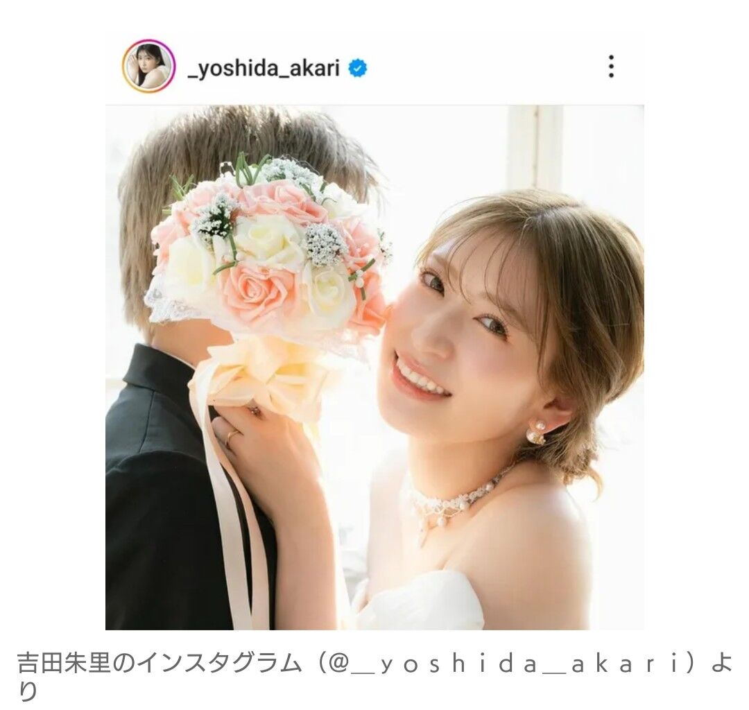 自身のインスタグラムでも結婚を報告。ウェディングフォトをアップして「いつもたくさんの応援ありがとうございます。先程YouTubeでご報告させて頂いたのですがこの度、吉田朱里は結婚致しました」と公表。