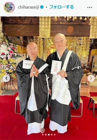 せいじはインスタグラムで、剃髪して墨染の衣を身にまとった写真などを投稿。「本日、得度式をあげさせていただきました。天台宗 千原靖賢和尚となりました。今後ともよろしくお願いします」と明らかにした