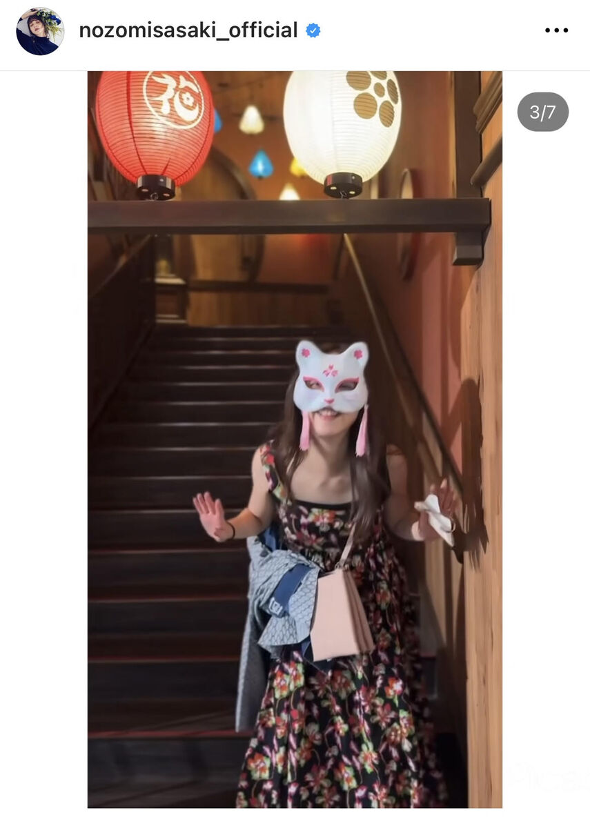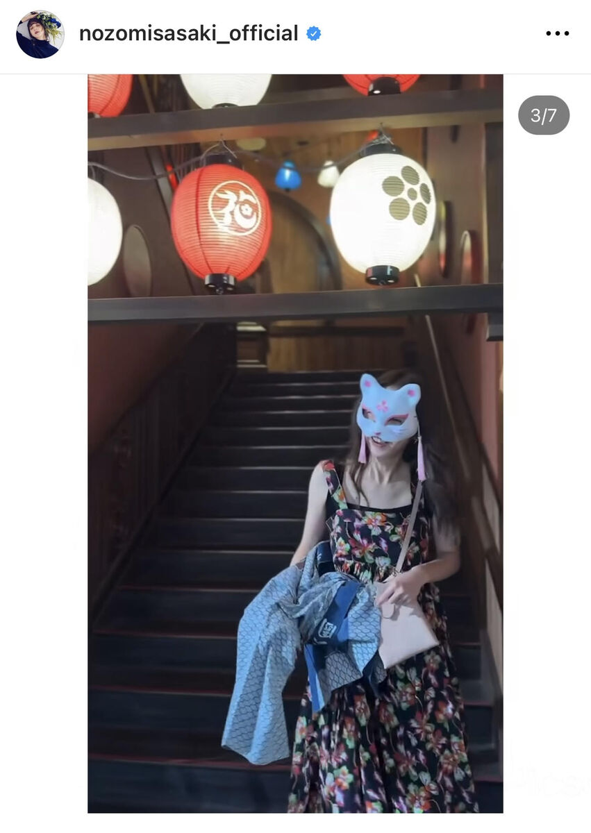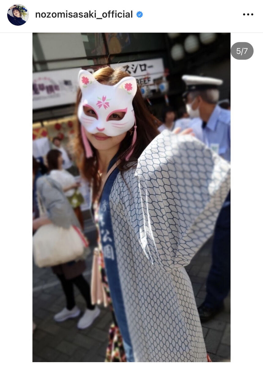 インスタグラムに「浅草の三社祭へ 仲良しファミリーにお世話になり 大人も子供も着替えました 子供達が一生懸命大きな声を出して神輿を担いでいて感動したし 素敵な経験をさせてもらえて心から感謝 仲良しファミリーのお家で食べたおにぎりや唐揚げなどが美味しくて体に染みた 楽しかったなぁ」とつづり、お祭りを楽しむ姿をアップ。キツネのお面を被る姿や、浅草の街並みの動画を投稿した。