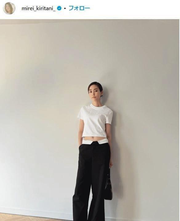 桐谷はインスタグラムで、ミニ丈の白シャツと黒のパンツというモノトーンコーデの写真を投稿。「暑いよねー 少しでも布を減らしたくてお腹だしちゃった」とし、極細のウエストを露出したショットを紹介した。