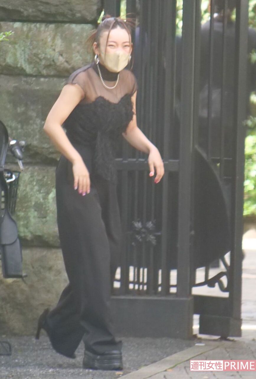 「ベージュのマスクをつけて、全身黒のドレッシーなオールインワン姿。左足はピンヒールのパンプス、右足は厚底の靴と、なぜか左右違う靴を履いていました(笑)。少し痩せたようには見えましたが、それでも元気そうな様子で、先に到着していた青山テルマさんと合流すると、仲よく式場に入って行きました。公私ともに仲のいい朝日さんのハレの場ですし、すごくうれしそうな表情をしていましたよ」