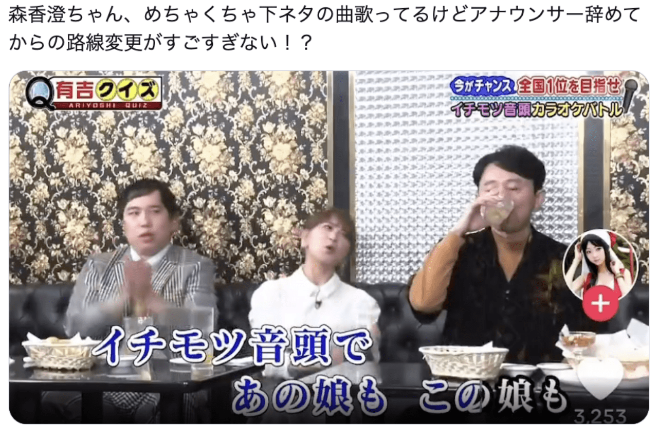 【衝撃発言】まじでぇ❕森香澄がカラオケで披露した「イチモツ音頭」が物議!ファンの反応とは?wwwwwwwwwwwwwwwwwwwww❕