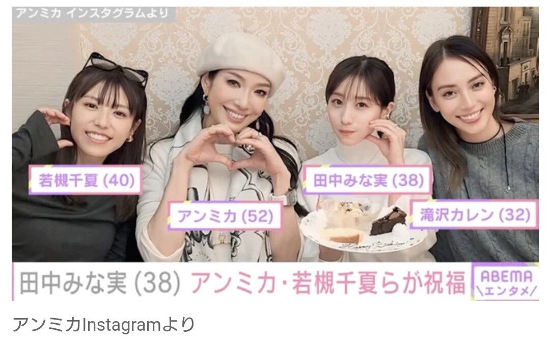 アンミカは、「先日、11月がお誕生日だった田中みな実ちゃんのお誕生日会を、滝沢カレンちゃん、若槻千夏ちゃんと開催。みんな多忙なのでやっと集えて、幸せな時間でした~。みな実ちゃんの肌がピカピカに光ってて、ムキ卵みたいでした。たくさん、美の情報を教えて頂いて、みんなその場で影響されて携帯でお買い物しちゃった」と4人で撮影した写真や、スイーツを前にほほえむ田中の写真を投稿した。