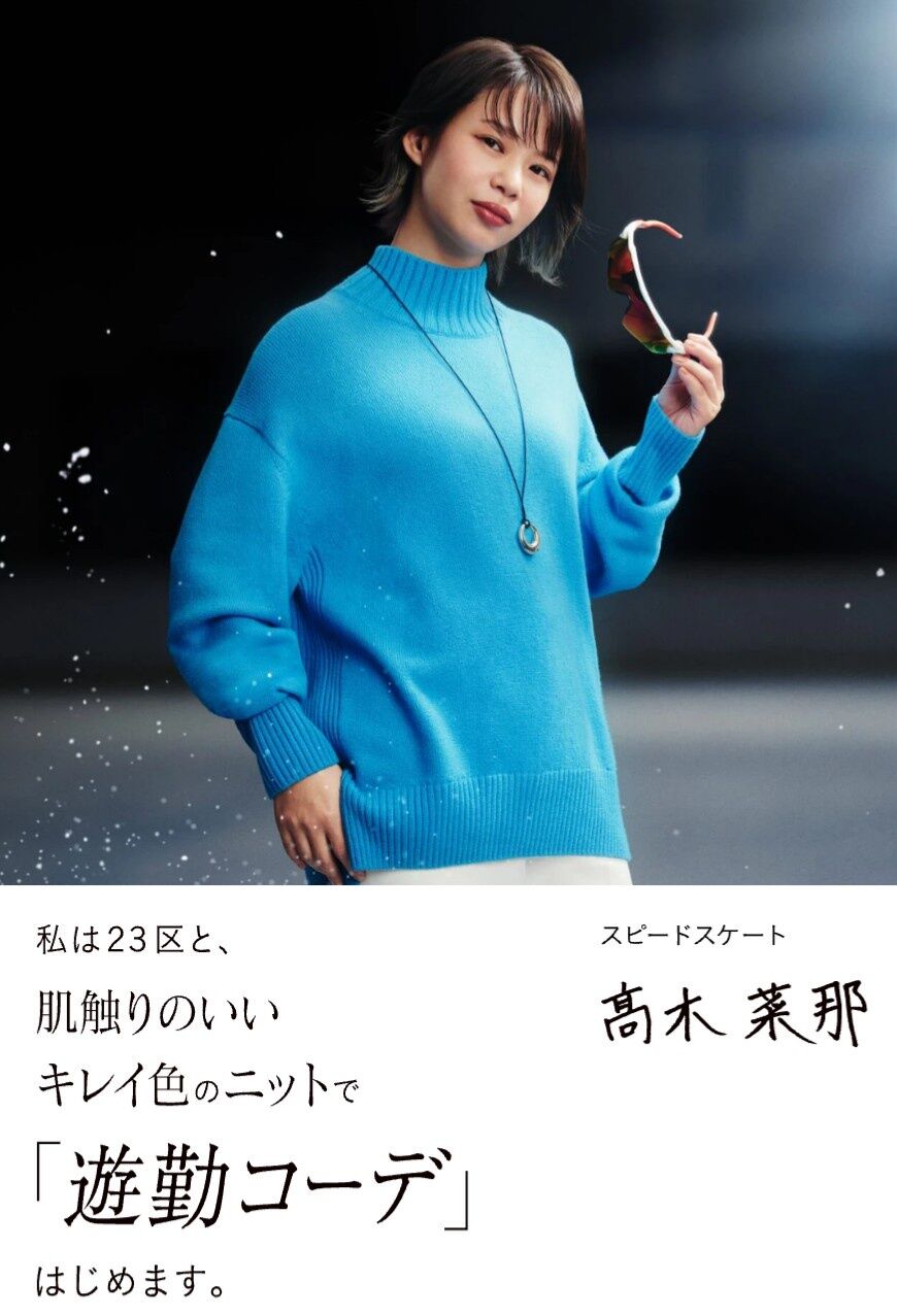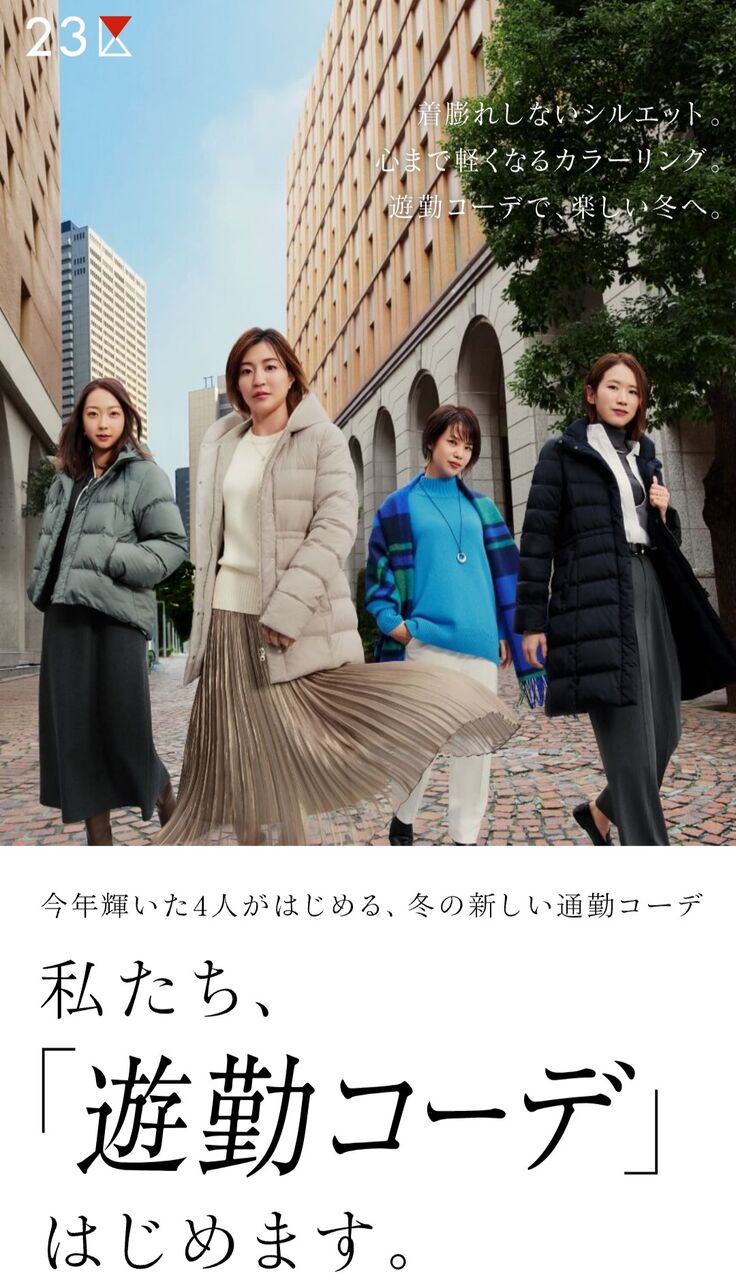 今回の広告で披露される「遊勤コーデ」は、冬の定番アイテムであるカシミヤブレンドニットや軽やかなダウンを使い、通勤やアフター5に対応したコーディネートを提案するもの。