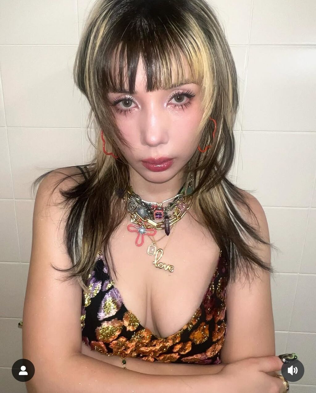 劇中で演じる主人公・結(橋本環奈)の姉・歩として出演し、ゴールドのメッシュがたっぷり入ったレイヤーヘアに美しいバストがのぞくキャミソールドレスを合わせたオフショットを投稿した。
