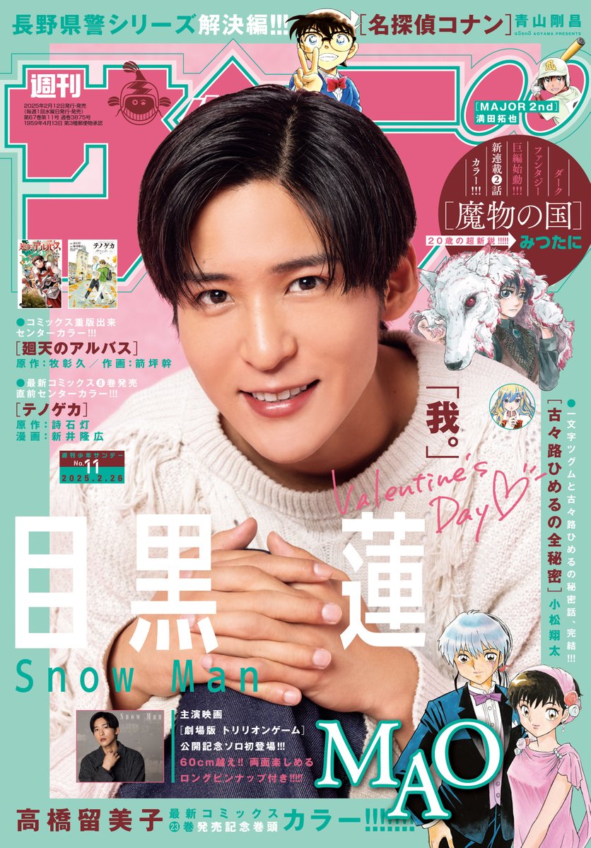 目黒蓮(Snow Man)が2月12日発売の「週刊少年サンデー」2025年11号の表紙に登場しているようです!