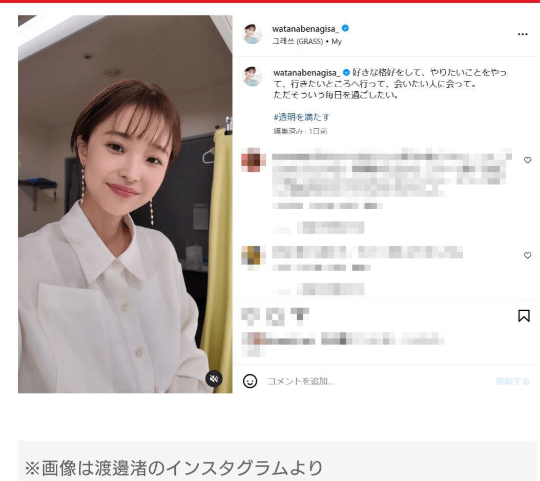 この日、渡邊は《好きな格好をして、やりたいことをやって、行きたいところへ行って、会いたい人に会って。ただそういう毎日を過ごしたい》《#透明を満たす》とつづり、2パターンのヘアメイクでカメラに視線を送るショート動画をアップ。