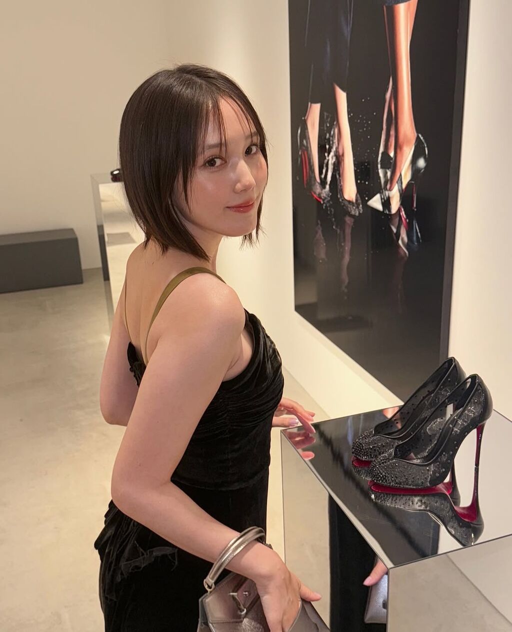 「『クリスチャンル*ン』と『メゾンマルジェラ』の初コラボレーションによるコレクションローンチイベントに行ってきました!」と書き出した上で、シックな黒のキャミワンピ姿を公開。デコルテは全開だった。