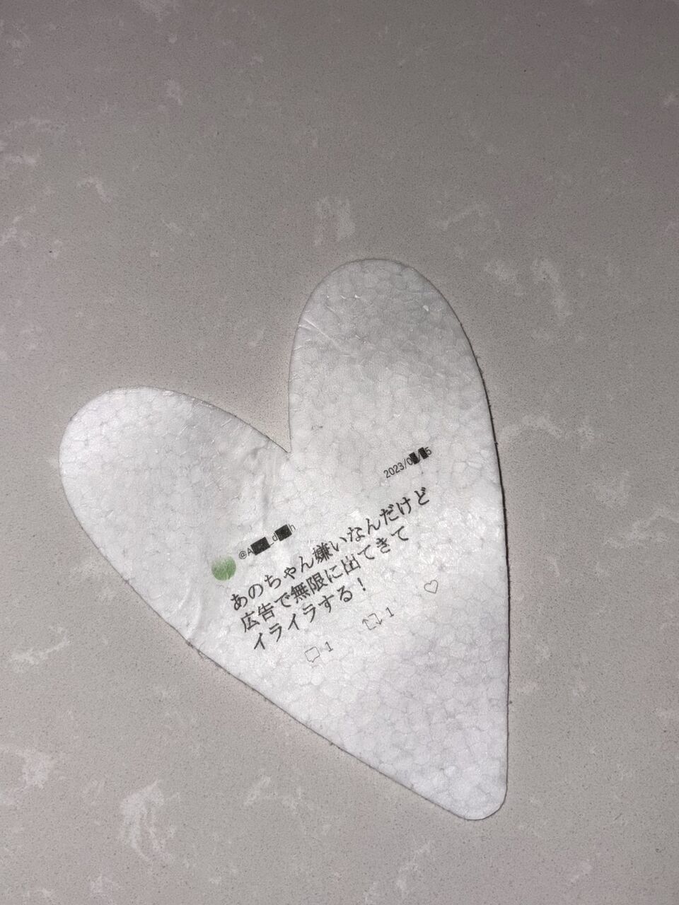 薄い発泡ポリスチレンで作られたハートにプリントされたのは、SNSに書き込まれたanoへのアンチコメント。