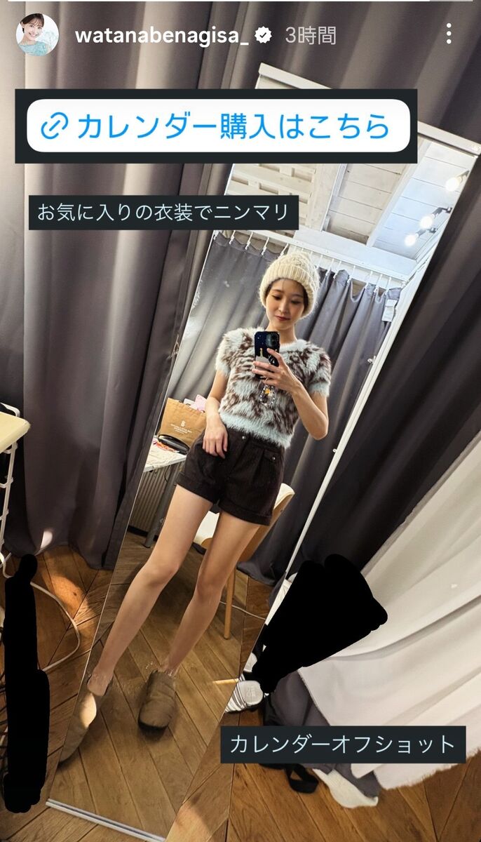 4日にインスタグラムのストーリーズを更新。来年のカレンダーのオフショットだといい、「お気に入りの衣装でニンマリ」と説明。ふわふわのファートップスにショートパンツを合わせたコーデ。スラリとした美脚が伸びる。白いニット帽をかぶり、キュートに仕上げた。