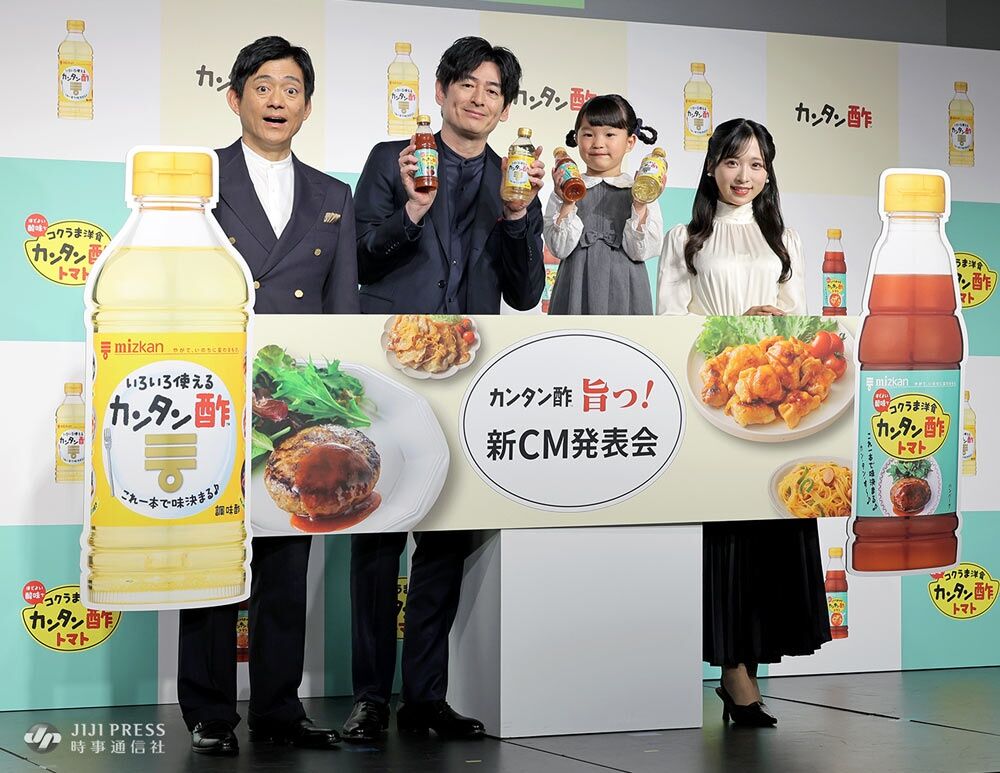 ミツカン「カンタン酢・カンタン酢トマト」の新CM発表会が行われ、博多華丸・大吉のお二人と小栗有以さん、村方乃々佳さんが出席しました。写真はフォトセッションの様子です。