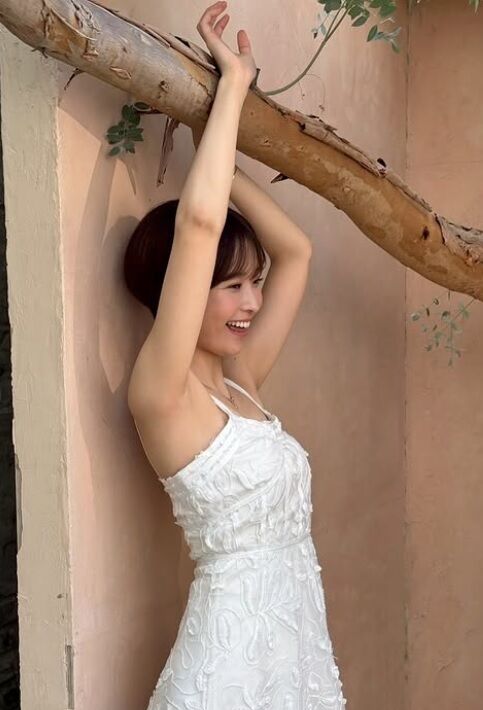 「2026年カレンダーオフショット。10月21日までの受注販売です」とつづり、透け感のある白のノースリーブ型の白いドレス姿を公開。頭上にある木の枝に手を伸ばし、美ワキ全開だった。