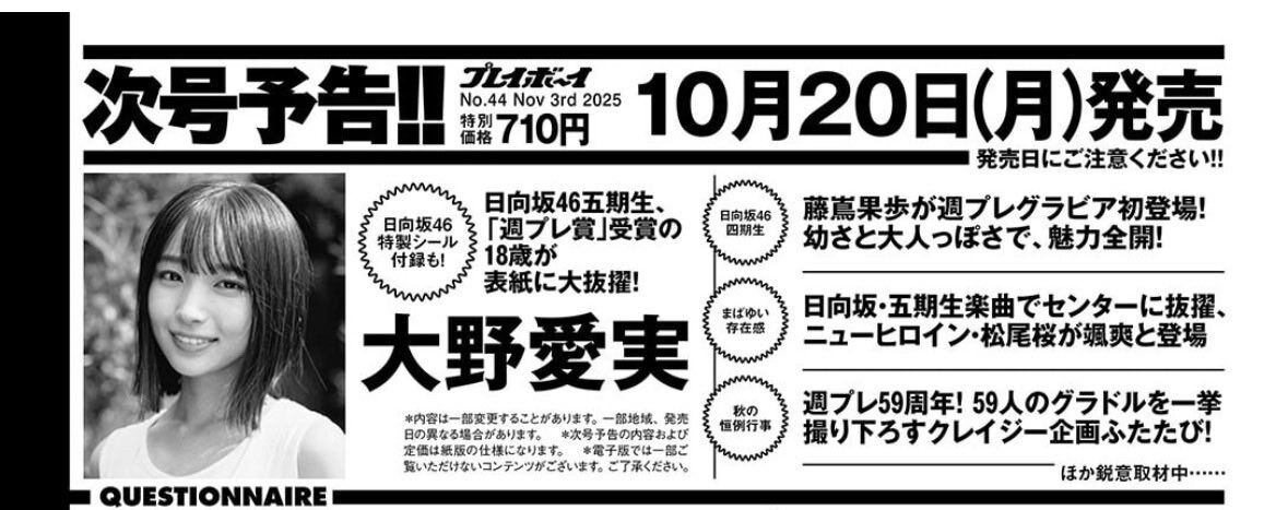 『週プレ』最新号表紙に、日向坂46の大型ルーキー大野愛実が大抜擢!藤嶌果歩、松尾 桜の撮り下ろしグラビアも …大野愛実 (C)熊谷貫/集英社 10月20日発売の『週刊プレイボーイ44号』に、日向坂46の特集が掲載。大野愛実(表紙 ※メイン写真)、藤嶌果歩、松尾… (出典:THE FIRST TIMES) |