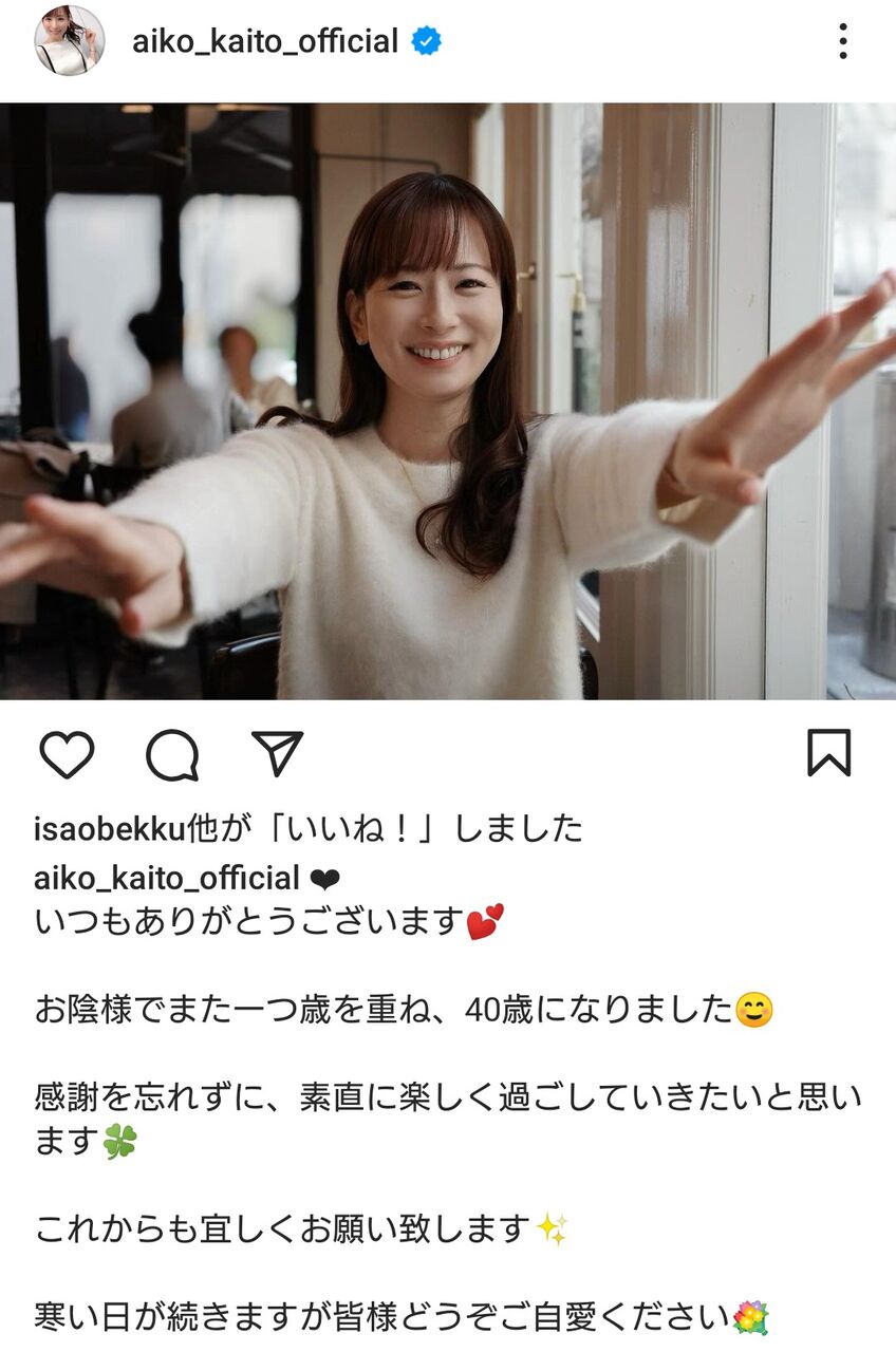 この日、皆藤は「いつもありがとうございます お陰様でまた一つ歳を重ね、40歳になりました 感謝を忘れずに、素直に楽しく過ごしていきたいと思います これからも宜しくお願い致します 寒い日が続きますが皆様どうぞご自愛ください」とファンへコメントし、白いニットセーターを身に着けてカメラに向かって両手を広げるショットを公開。