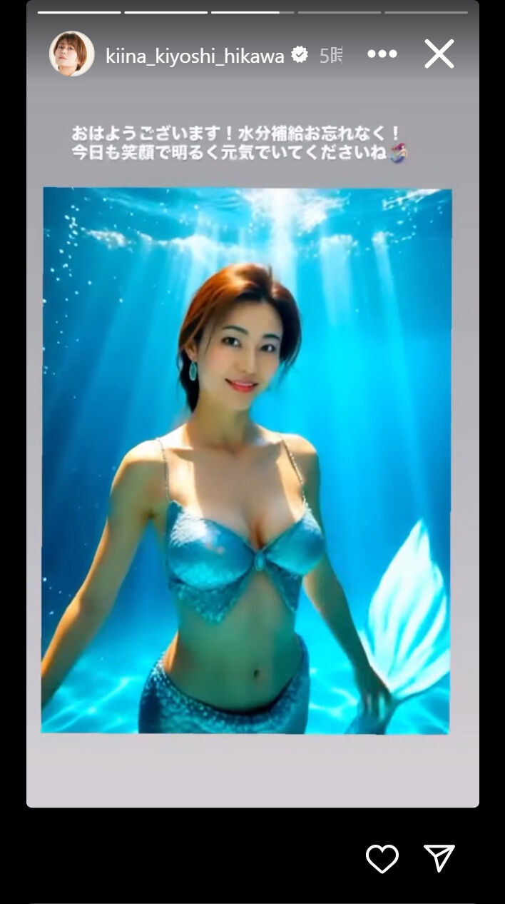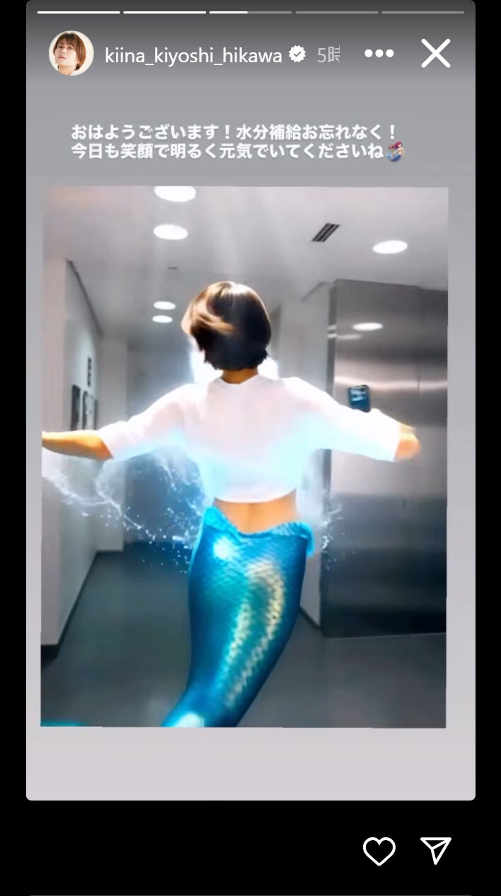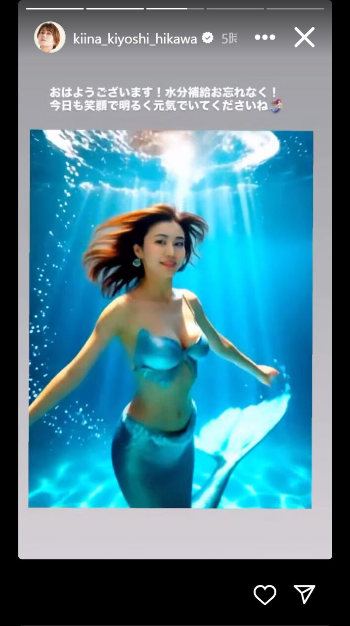 氷川はストーリーズで「暑いからこればっか飲んでうろちょろしてるwww」と記し、美脚の太ももの上にペットボトル飲料を乗せたショットをアップ。そして「おはようございます!水分補給お忘れなく!今日も元気で明るく元気でいてくださいね」とつづり、スマホで自撮りしている場面から後ろを向いて振り返ったところで、下半身が青い人魚に”変身“し、髪も長く、美しく膨らんだバストをビキニ状のもので隠し、お腹部分や胸から上を露出しているように見える姿になる、加工動画もアップした。