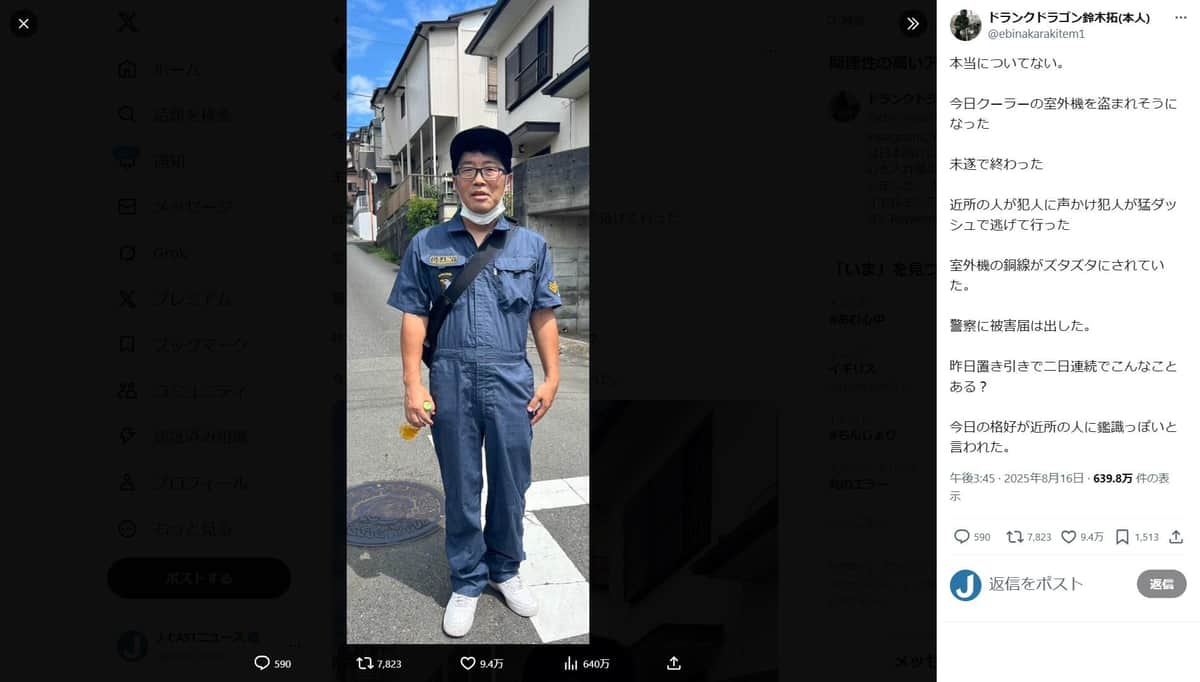 お笑いコンビ「ドランクドラゴン」の鈴木拓(49)が16日、自身のX(旧ツイッター)を更新。自宅のエアコンの室外機を盗まれそうになり、警察に被害届を提出したことを報告した。