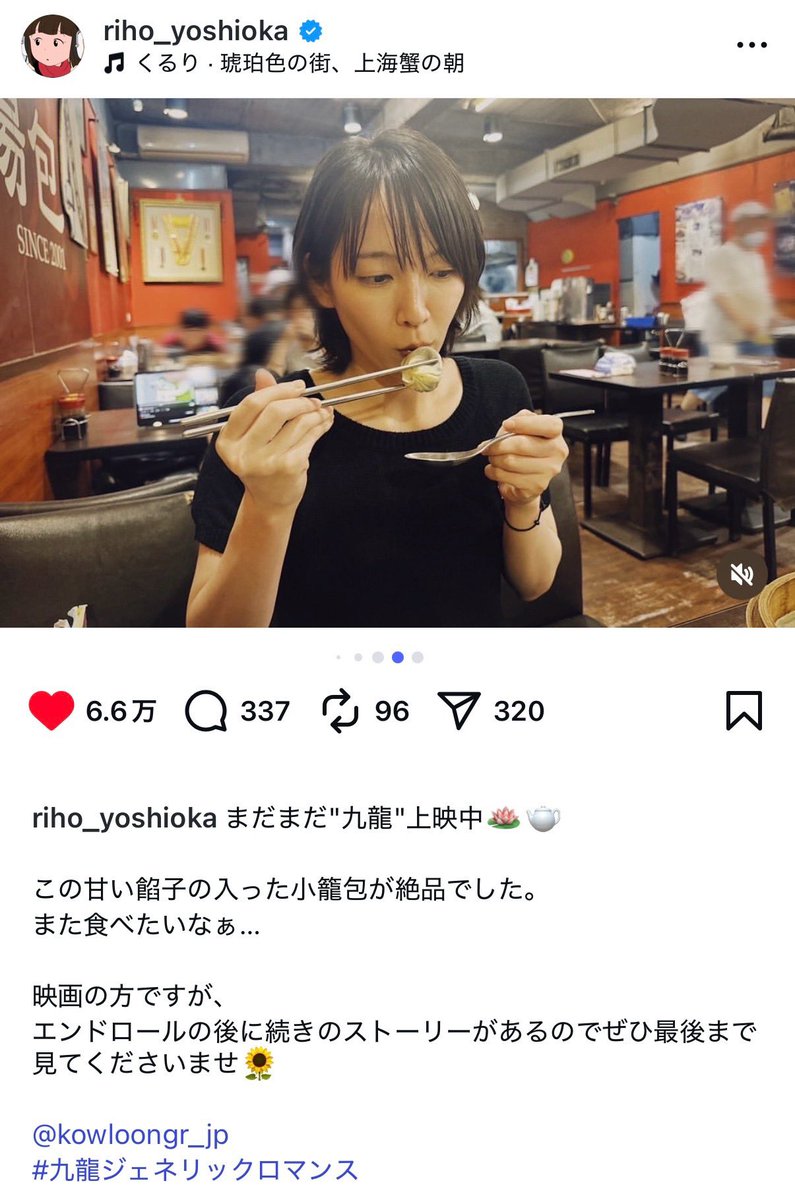 熱そうな小籠包をレンゲに載せてほおばる写真に触れ「まだまだ”九龍”上映中この餡子の入った小籠包が絶品でした。また食べたいなぁ…」と振り返った。