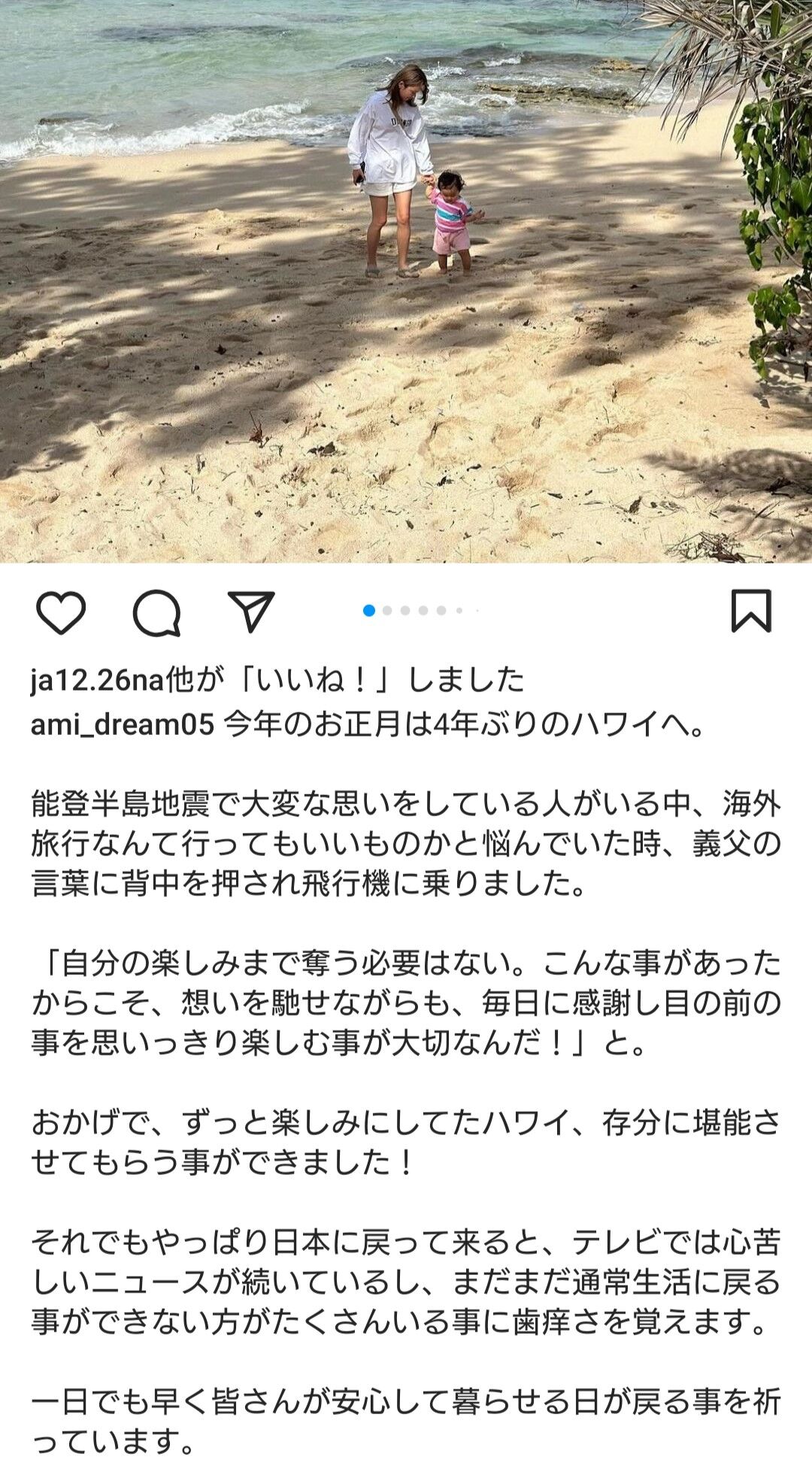 Amiはインスタグラムで「今年のお正月は4年ぶりのハワイへ。」とつづり、ビーチで遊ぶ様子やスーパーで買い物をする様子などを披露。