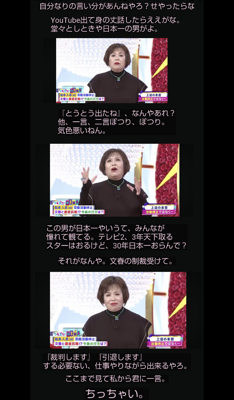 【芸能】上沼恵美子が松本に言った一言 2024年1月15日 最終更新日時 : 2024年1月15日 guest 【驚き】まじでぇ❕「あまりにもひどい言葉」 Cocomi アンチが放った“悪態”にネット衝撃… “木村拓哉の娘”という宿命 wwwwwwwwwwwwwwwww❕ 【驚き】まじでぇ❕石原さとみ、『難民映画祭』に登場 子供たちへの願い明かす「世界の平和を真剣に考えられる人に」「本質たどればみんな同じ命」wwwwwwwwwww❕ 【芸能】活動再開 沢尻エリカ(39)にオファー殺到 演技力の衰えなし… 【芸能】柴咲コウ(44)キュートなポーズのオフショット 【芸能】宇多田ヒカル(42)が一部週刊誌報道に苦言 クマ被害と自身の過去発言絡めた構成に 石原さとみが『難民映画祭』で子供たちへのメッセージを世界の平和を発信! タレントでインフルエンサー逮捕!生後3ヶ月の娘に何が起こったのかを考察する Nikiって誰「世界で最も美しい顔100人」山本由伸と恋愛事情 ガーシーらと旅行もwww 立川志らくが言うSNS初心者への警告!チョコプラ松尾の『素人はSNSやるな』発言に共感 小島瑠璃子の中国爆食体験!日本人が食べない生き物の魅力とは? 【芸能】上沼恵美子が松本に言った一言 (出典 上沼恵美子「松本よ。私から君に一言。”ちっちゃい”」) 1 以下、?ちゃんねるからVIPがお送りします :2024/01/14(日) 15:13:00.208 ID:XY3UKb+Td.net やめたれwwww (出典 i.imgur.com) (出典 上沼恵美子「松本よ。私から君に一言。”ちっちゃい”」) 続きを読む 続きを見る 【驚き】まじでぇ❕「あまりにもひどい言葉」 Cocomi アンチが放った“悪態”にネット衝撃… “木村拓哉の娘”という宿命 wwwwwwwwwwwwwwwww❕ 【驚き】まじでぇ❕石原さとみ、『難民映画祭』に登場 子供たちへの願い明かす「世界の平和を真剣に考えられる人に」「本質たどればみんな同じ命」wwwwwwwwwww❕ 【芸能】活動再開 沢尻エリカ(39)にオファー殺到 演技力の衰えなし… 【芸能】柴咲コウ(44)キュートなポーズのオフショット 【芸能】宇多田ヒカル(42)が一部週刊誌報道に苦言 クマ被害と自身の過去発言絡めた構成に 石原さとみが『難民映画祭』で子供たちへのメッセージを世界の平和を発信! タレントでインフルエンサー逮捕!生後3ヶ月の娘に何が起こったのかを考察する Nikiって誰「世界で最も美しい顔100人」山本由伸と恋愛事情 ガーシーらと旅行もwww 関連記事 関連記事はありません。