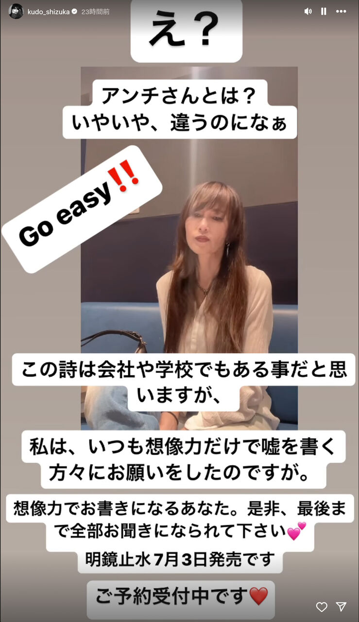 工藤はストーリーズで「誹謗中傷 もはや弱小 千差万別 逆手にとって 揚げ足取り 何が望み? Go easy!!」などと歌う動画とともに「え?アンチさんとは?いやいや、違うのになぁ」と呼びかけ新曲「Go easy!!」と紹介。「この詩は会社や学校でもある事だと思いますが、」「私は、いつも想像力だけで嘘を書く方々にお願いをしたのですが。」「想像力でお書きになるあなた。是非、最後まで全部お聞きになられて下さい」と続け、新譜について告知した。