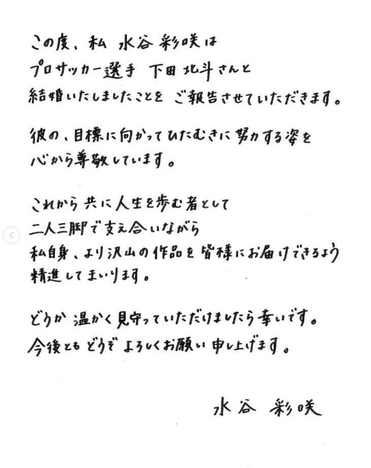 水谷さんは、インスタグラムに花束の写真と直筆の文面を投稿。「この度、私水谷彩咲はプロサッカー選手下田北斗さんと結婚いたしましたことをご報告させていただきます。」と知らせました。