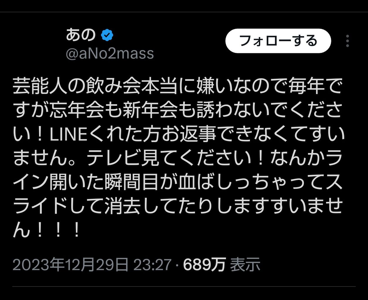 あのちゃんの気持ちは分かります。特に忘年会や新年会のシーズンは、芸能人たちのスケジュールがいっそう忙しくなるので、余計なプレッシャーや疲れも増えることでしょう。