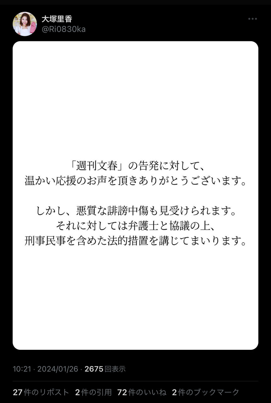 【重大告発】大塚里香さんが松本を提訴!法的措置の波紋が広がる 2024年1月26日 最終更新日時 : 2024年1月26日 guest 【芸能】『のりぴー』酒井法子(54)の美ぼうに仰天 【衝撃発言】まじでぇ❕小島瑠璃子、901日ぶりに公の場に登場! 10月から芸能活動を再開 自ら売り込み「お話いただけると大変ありがたい」wwwwwwwwwwwwww❕ 【芸能】細川ふみえ (54)銚子電鉄で1日駅長に 【芸能】皆藤愛子(41)「#安心してください #履いてるよ」 【驚き】まじでぇ❕福留光帆 AKB時代の先輩メンバーからの“嫌がらせ”ぶっちゃけwwwwwwwwwwwwwwwww❕ 【芸能】華原朋美(51)1カ月前の“激痩せ近影”にSNS騒然… 【芸能】前田敦子(34)美ヒップあらわな衝撃ショット 【驚き】まじでぇ❕<永野芽郁>2026年カレンダー 一緒に過ごす“春夏秋冬” 「来年もファンの皆さんと共に歩んでいきたい」という思いを込めてwwwwwwwwww❕ 大久保佳代子に言い寄る男たち!事実婚の裏側はどうなってるんやwww 本田翼のミニスカ秋コーデ!絶対領域が魅せるスタイルの秘密 【重大告発】大塚里香さんが松本を提訴!法的措置の波紋が広がる 泉里香 泉 里香(いずみ りか、1988年〈昭和63年〉10月11日 – )は、日本の女性ファッションモデル、グラビアアイドル、女優。本名同じ。スターダストプロモーション所属。浜 千咲(はま ちさき)、梨華(りか)での活動歴がある。京都府京都市伏見区出身。明治大学文学部文学科英米文学専攻卒業。 「浜千咲」名義… 39キロバイト (5,104 語) – 2024年1月13日 (土) 22:07 (出典 rika-otsuka.jp) 大塚里香さんに対する誹謗中傷は許されません。彼女は勇気を持って告発したことを尊敬します。弱い立場にある人を攻撃するのではなく、公正な判断を待つべきです。 (出典 【悲報】松本を告発した大塚里香さん、誹謗中傷に法的措置開始。弱男はどこまで絞られるのか) 1 それでも動く名無し :2024/01/26(金) 15:41:11.31 ID:ta4iZSps0 (出典 i.imgur.com) (出典 【悲報】松本を告発した大塚里香さん、誹謗中傷に法的措置開始。弱男はどこまで絞られるのか) 続きを読む 続きを見る 【芸能】『のりぴー』酒井法子(54)の美ぼうに仰天 【衝撃発言】まじでぇ❕小島瑠璃子、901日ぶりに公の場に登場! 10月から芸能活動を再開 自ら売り込み「お話いただけると大変ありがたい」wwwwwwwwwwwwww❕ 【芸能】細川ふみえ (54)銚子電鉄で1日駅長に 【芸能】皆藤愛子(41)「#安心してください #履いてるよ」 【驚き】まじでぇ❕福留光帆 AKB時代の先輩メンバーからの“嫌がらせ”ぶっちゃけwwwwwwwwwwwwwwwww❕ 【芸能】華原朋美(51)1カ月前の“激痩せ近影”にSNS騒然… 【芸能】前田敦子(34)美ヒップあらわな衝撃ショット 【驚き】まじでぇ❕<永野芽郁>2026年カレンダー 一緒に過ごす“春夏秋冬” 「来年もファンの皆さんと共に歩んでいきたい」という思いを込めてwwwwwwwwww❕ 関連記事 関連記事はありません。