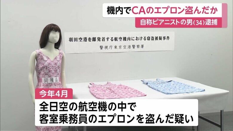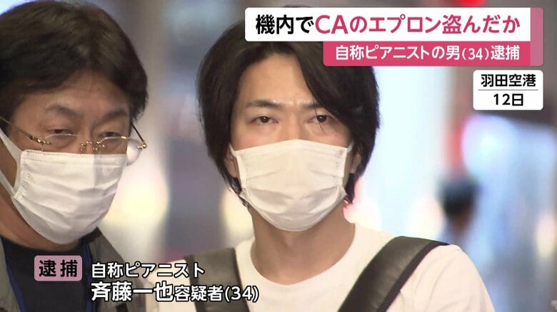 航空機内で客室乗務員(CA)が身にまとうエプロンを盗んだとして、警視庁東京空港署は14日までに、窃盗容疑で、ピアニスト斉藤一也容疑者(34)=東京都練馬区南田中=を逮捕した。「女性の制服をコレクションするのが趣味。においを嗅いだり、自分で着たりしていた」と容疑を認めている。