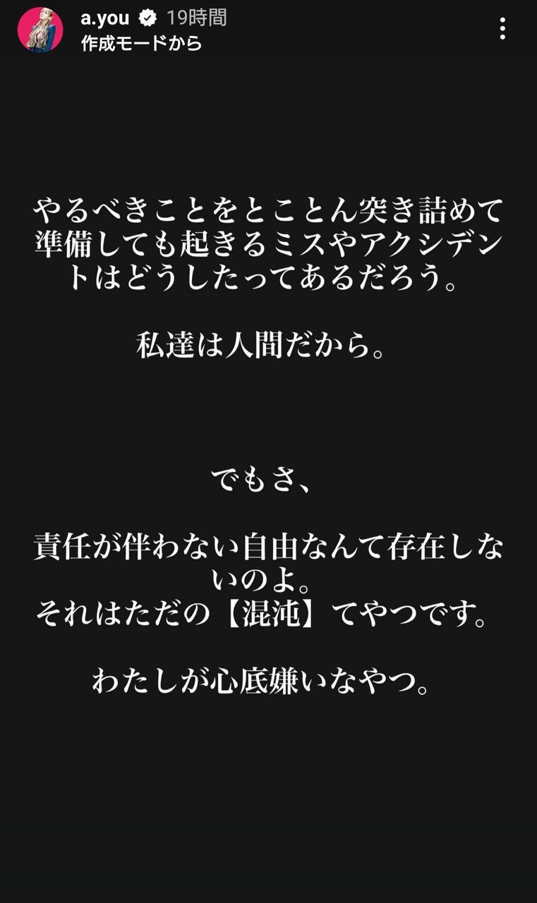 その浜崎だが、福岡公演の1日目を終えた10日深夜に意味深な投稿を公式インスタグラムのストーリーズにアップしていた。