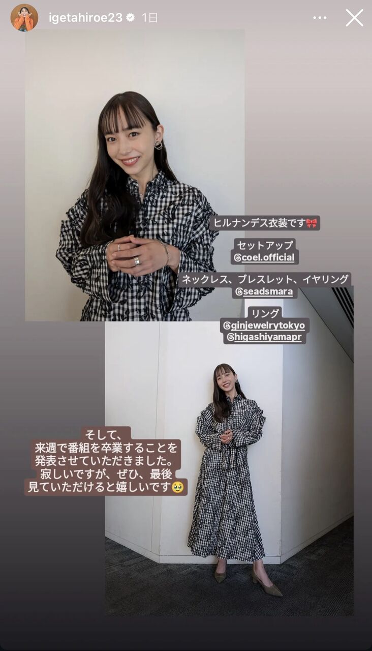 井桁は「ヒルナンデス衣装です」とチェック模様のセットアップを着用した姿を投稿し「そして、来週で番組を卒業することを発表させていただきました。寂しいですが、ぜひ、最後まで見ていただけると嬉しいです」と視聴者へ呼びかけた。