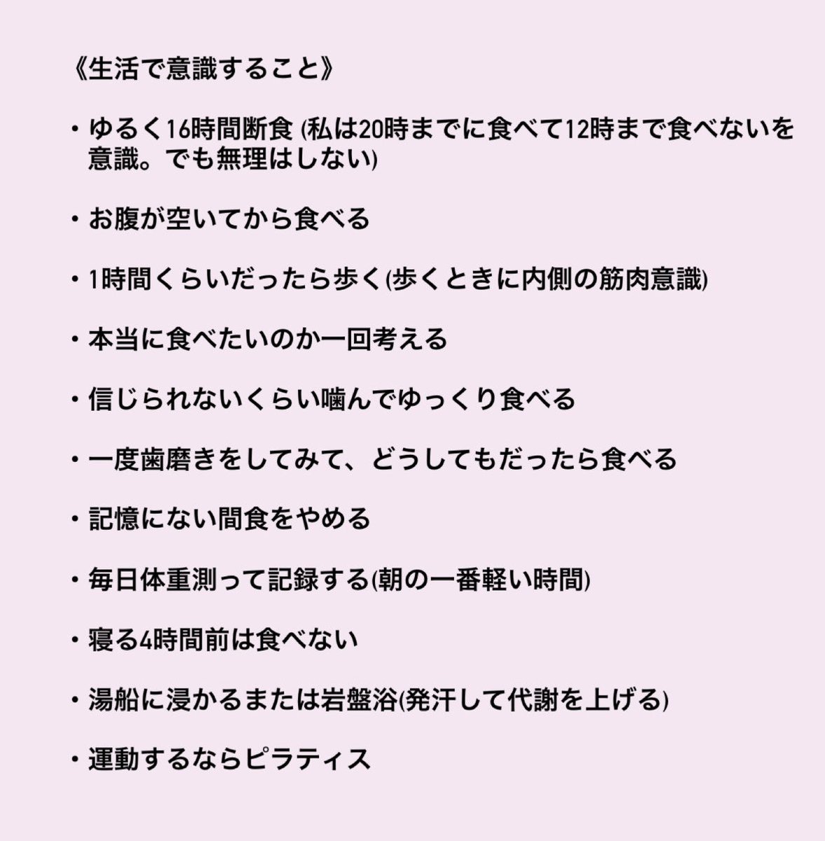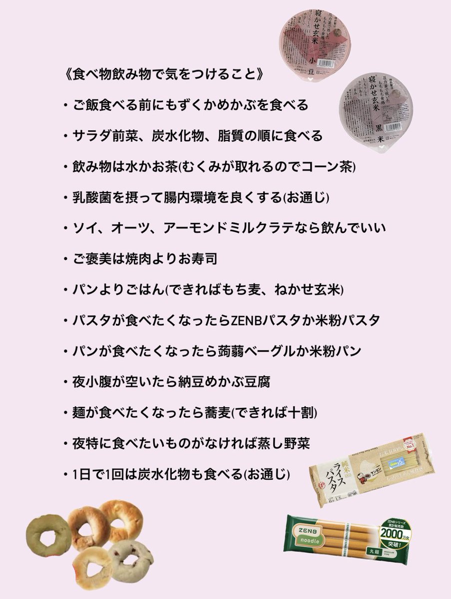 続けて「ただ、これはあくまで私の方法で体質によって違うところもあるので、それを踏まえた上で参考にしてみてください!」と補足し、7キロ減量前の写真と現在の写真をアップし「beforeの写真やばすぎますね…」と本音を吐露。他にも「生活で意識すること」「食べ物飲み物で気をつけること」と題した箇条書きのメモも公開した。
