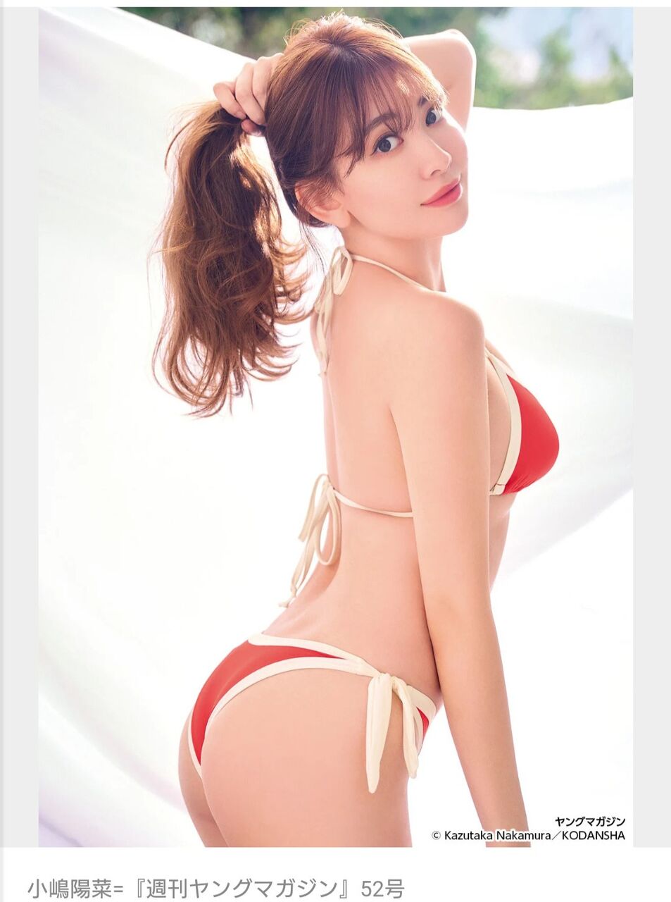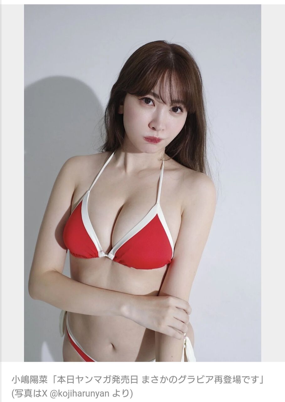 《まさかのグラビア再登場です》というコメントとともに小嶋が紹介したのは、同日に発売された『週刊ヤングマガジン』の表紙を飾った衣装のオフショット。白縁の真っ赤なビキニを着用した写真で、美しいバストが際立っていた。