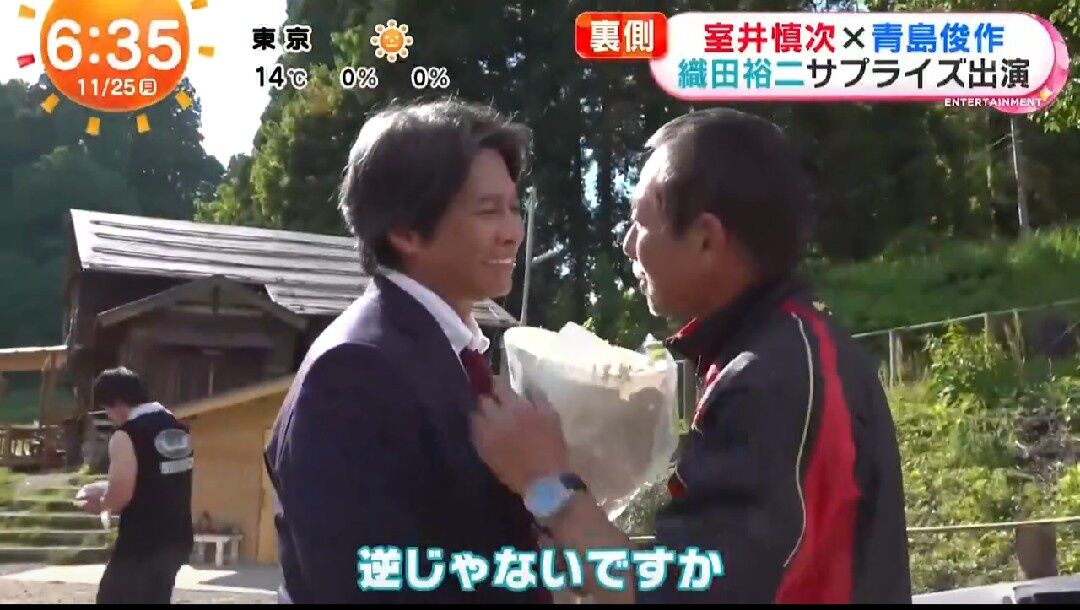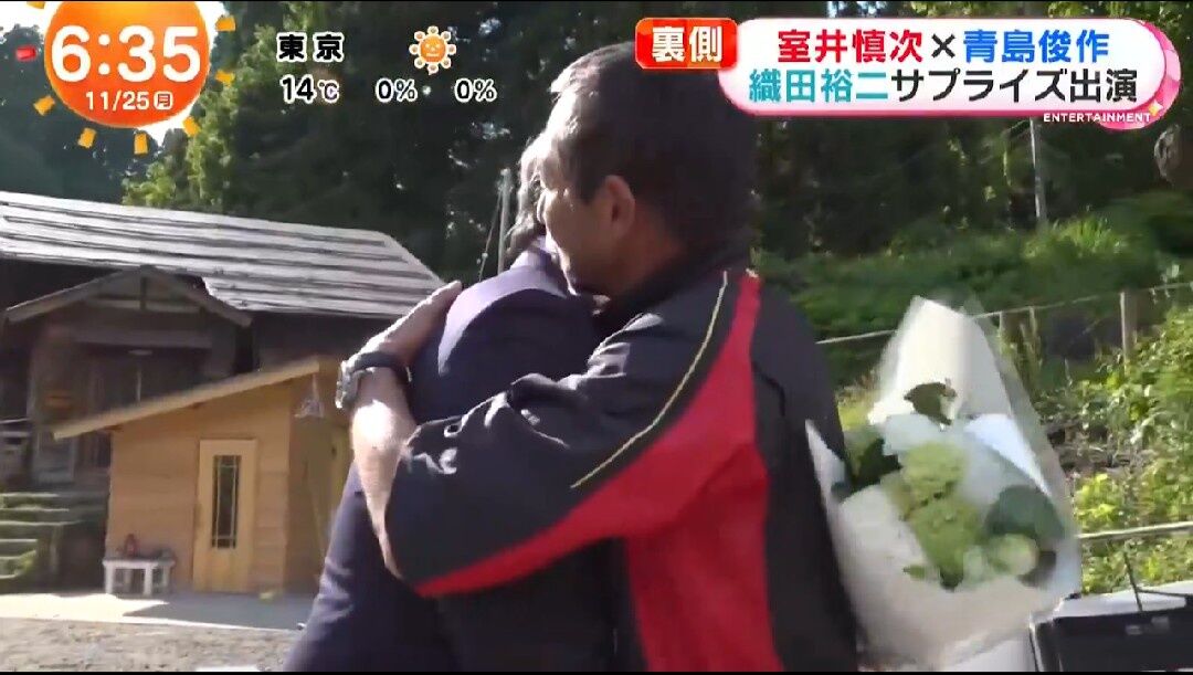 織田が「どうも、ご無沙汰しております。すみません、先輩」と呼びかけて、笑顔で柳葉のもとに近づいていく。柳葉が手を差し出して「ご無沙汰してます。どうもです」と応じると、2人で抱擁を交わした。