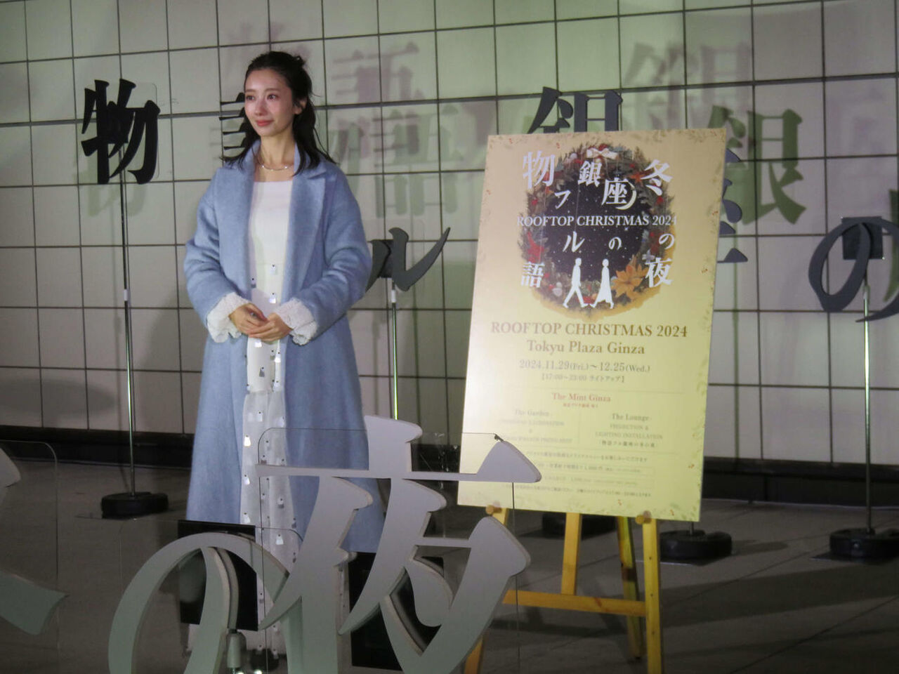 東急プラザ銀座では25日まで「物語フル銀座の冬の夜」をテーマに、プロジェクションマッピングと照明演出で浮かび上がる文字で幻想的な空間を演出している。「クリスマスでイルミネーションだったりとか、銀座の街もすごくきらめくじゃないですか。その光を受けて自分も輝けるように、白をチョイスしてきました」と、白いワンピースに水色のコートを羽織って登場した。