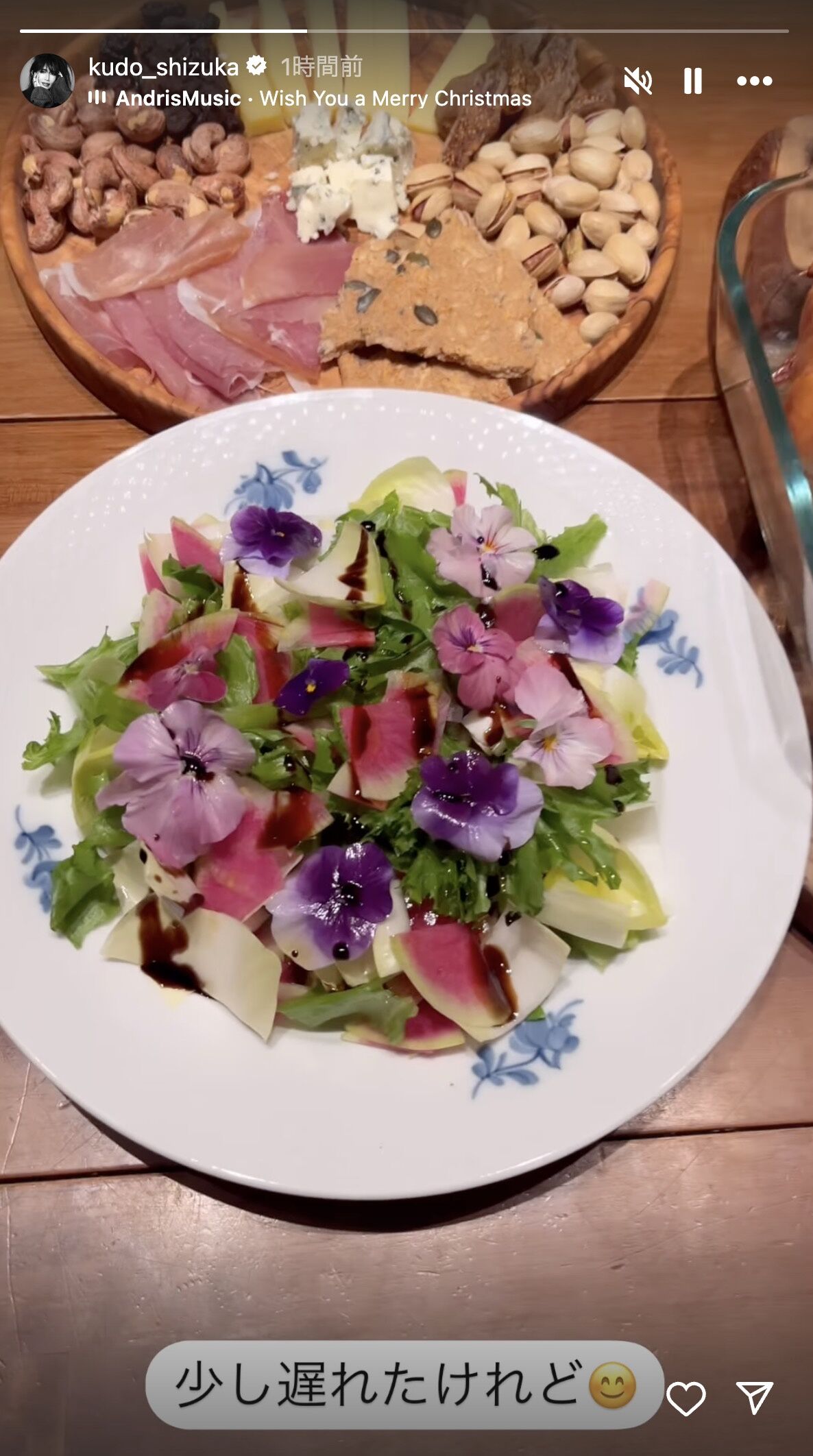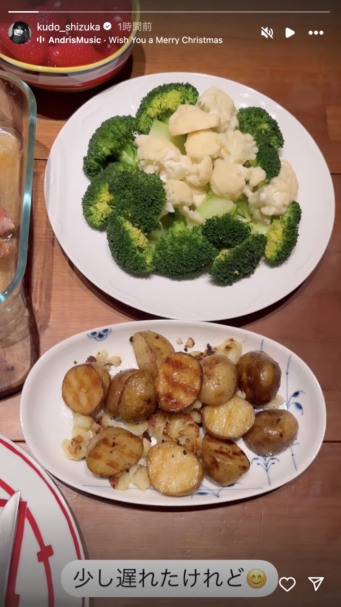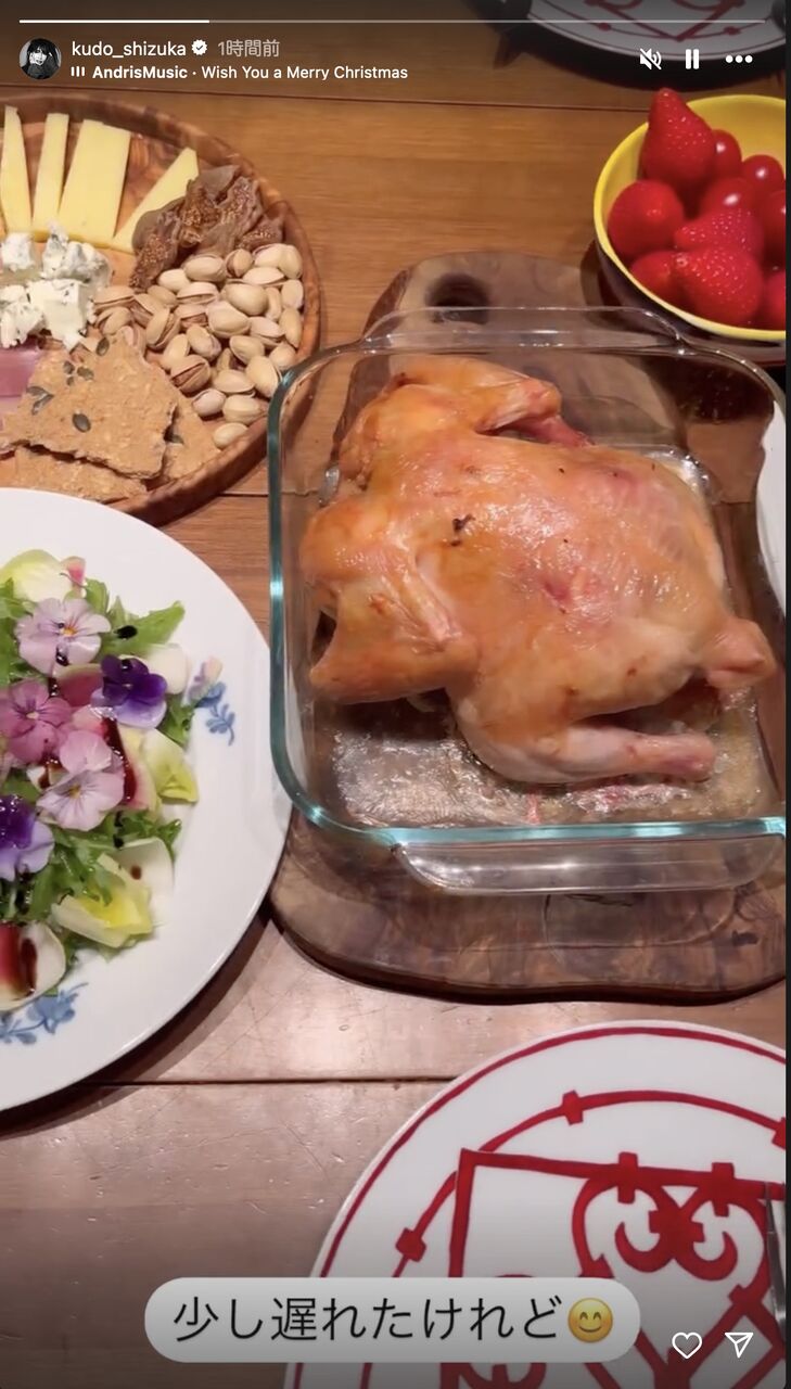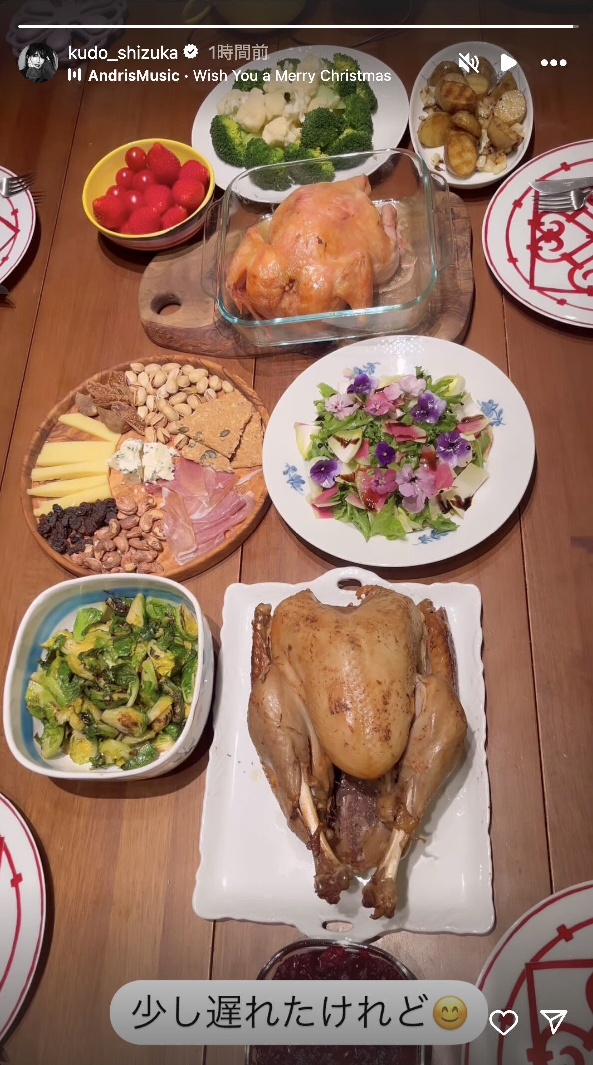 料理上手で知られる工藤。24時間で消えるストーリーズ機能を使って「少し遅れたけど」と言葉を添え、ディナーの動画をアップ。丸焼きのターキー2羽がどーんとテーブルの中央にあり、ベリーソースも置かれている。