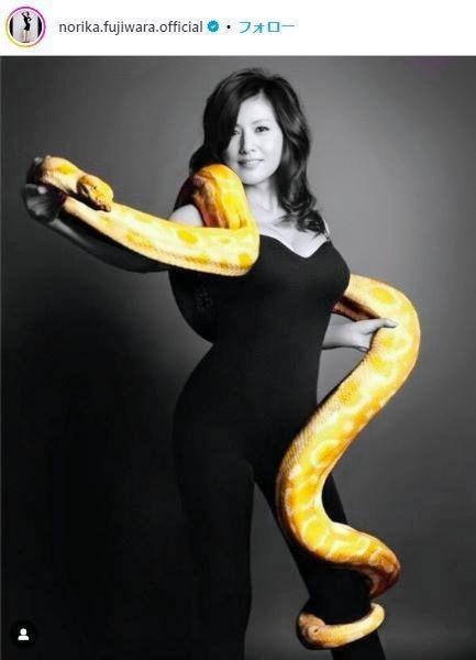 藤原はインスタグラムで、デコルテもあらわな黒のロングドレス姿で、金色の大蛇を巻き付けた衝撃の写真を掲載。「さらなる高みへ」としつつ、「#本年もよろしくお願いします」「#巳さま」などとハッシュタグを加えて投稿した。