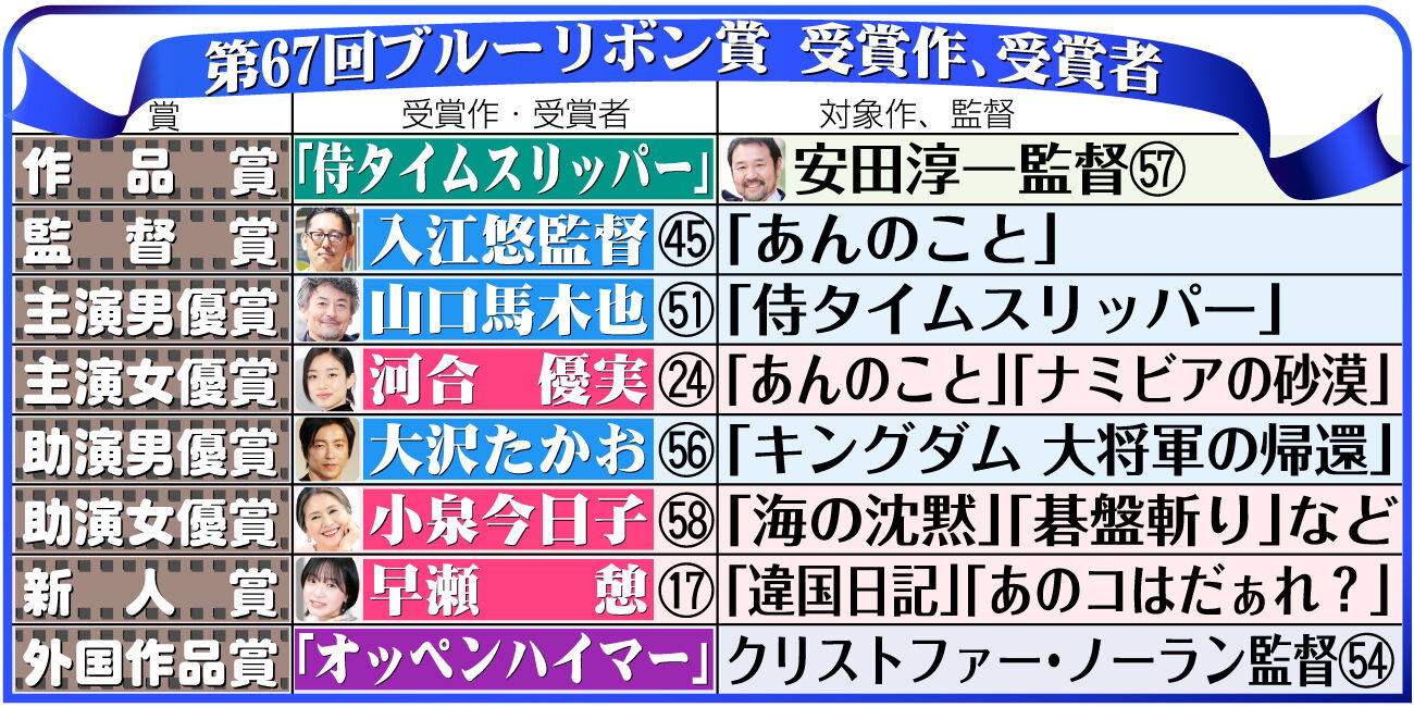 東京映画記者会(日刊スポーツなど在京スポーツ紙7紙の映画担当記者で構成)主催の第67回(24年度)ブルーリボン賞が28日までに決定した。授賞式は2月12日に都内で開催する。