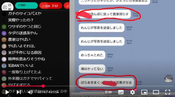画面に示されたスクリーンショットでは「〇〇の田んぼに放って農家困らす」「ばらきまくって◯◯に定着させる」(※◯◯は地域名とのこと)との発言がありました。