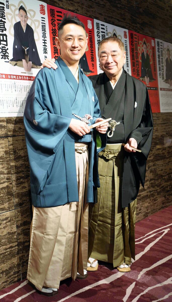 襲名披露パーティーを行った7代目三遊亭円楽(左)と父の三遊亭好楽