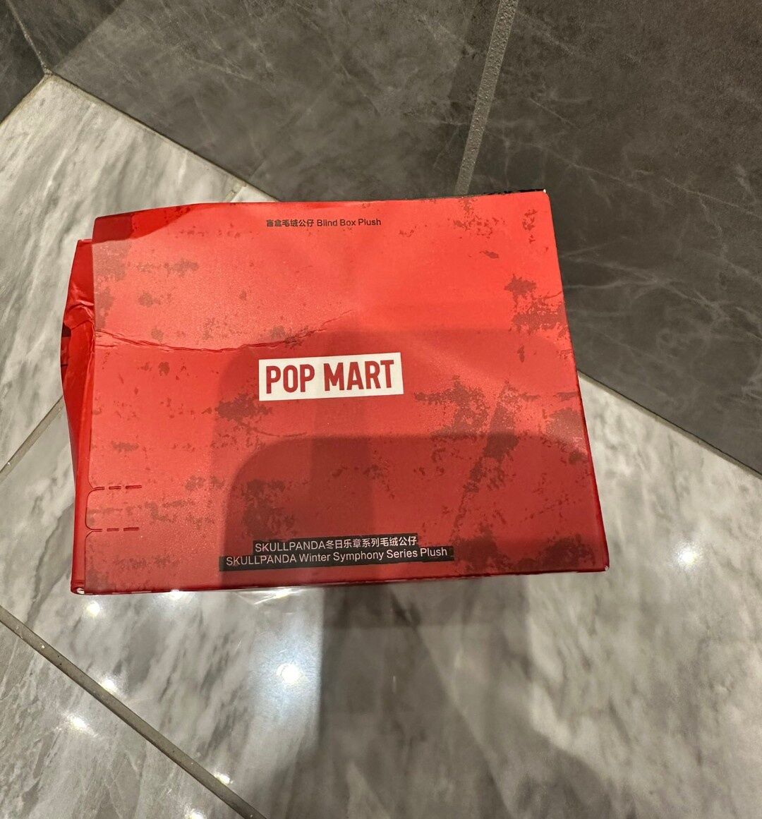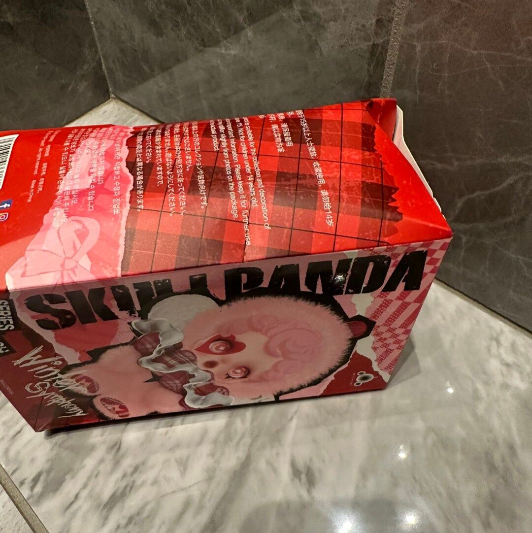 フィギュアもしくはぬいぐるみが入っていると思われる赤い箱も、大きく凹んでしまっていて、フタの部分に強くシワが入ってしまっています。