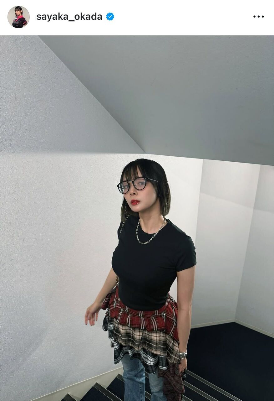 岡田は「sheinのスカート褒められた スタイルよく見えるね!加工はしてないよん」とつづり、ボディーラインが強調された黒の半袖Tシャツに、デニムのパンツの上からスカートを合わせたコーディネートを披露した。