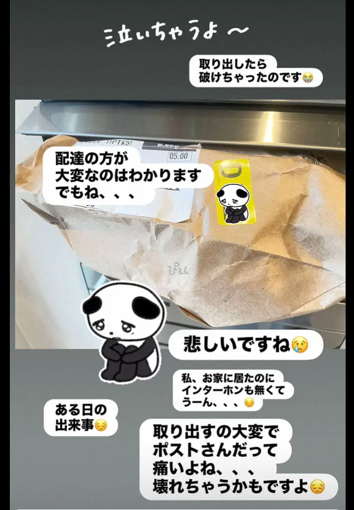 「配達の方が大変なのはわかります」としながらも「でもね、、、悲しいですね」と涙目のパンダのイラストを添えて投稿。