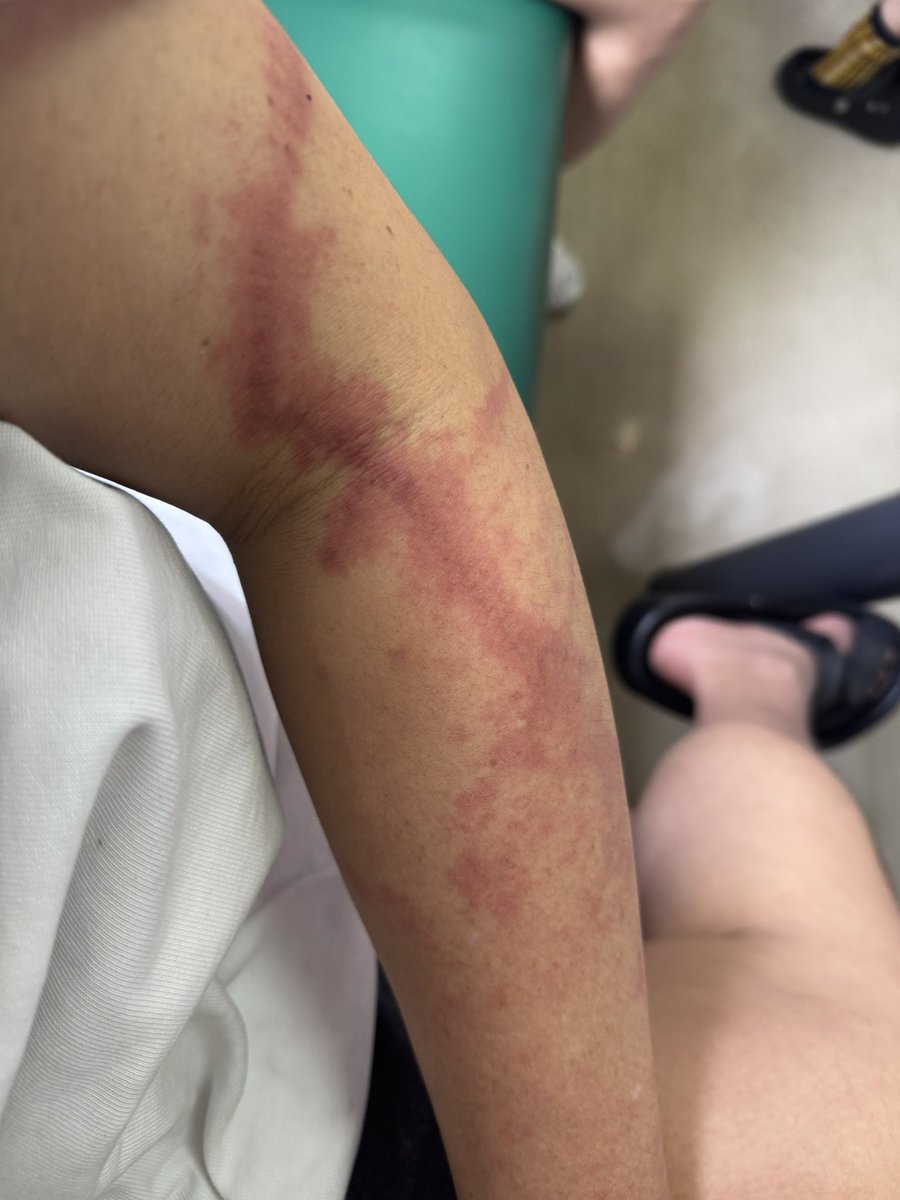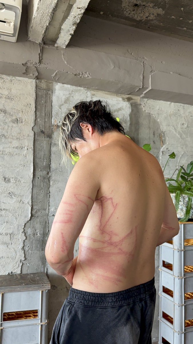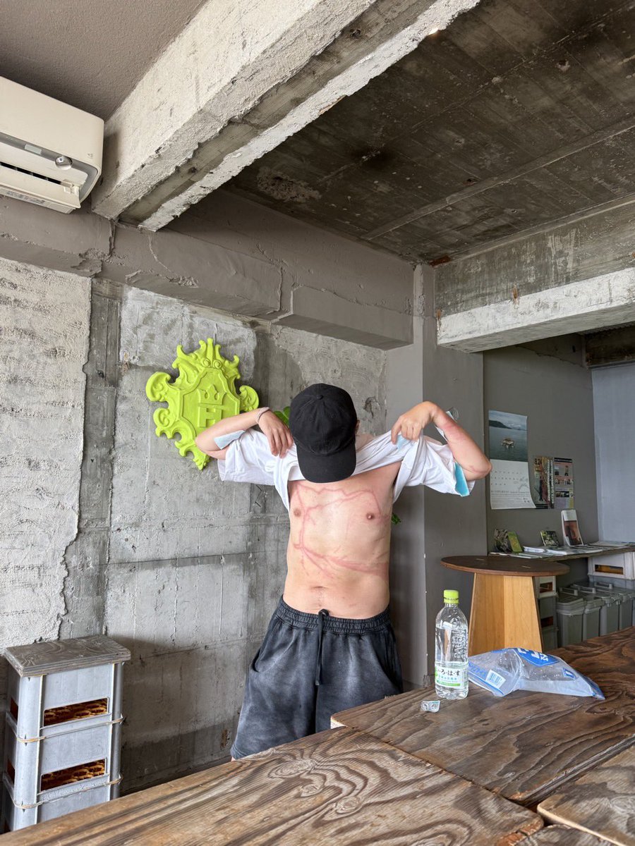 村本は「お盆過ぎた海で泳いだらカツオノエボシとかいう美しい化け物にハグされて救急車で運ばれた」と写真を投稿。胴回りや腕には痛々しい刺された痕が残っていた。