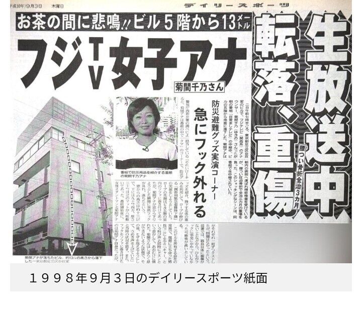 菊間氏は26歳だった1998年9月、「めざましテレビ」の防災避難グッズを紹介するコーナーで、火災などの緊急避難用降下機に乗って体験リポート中、誤って留め金(フック)が外れ、地上のマットに落下。